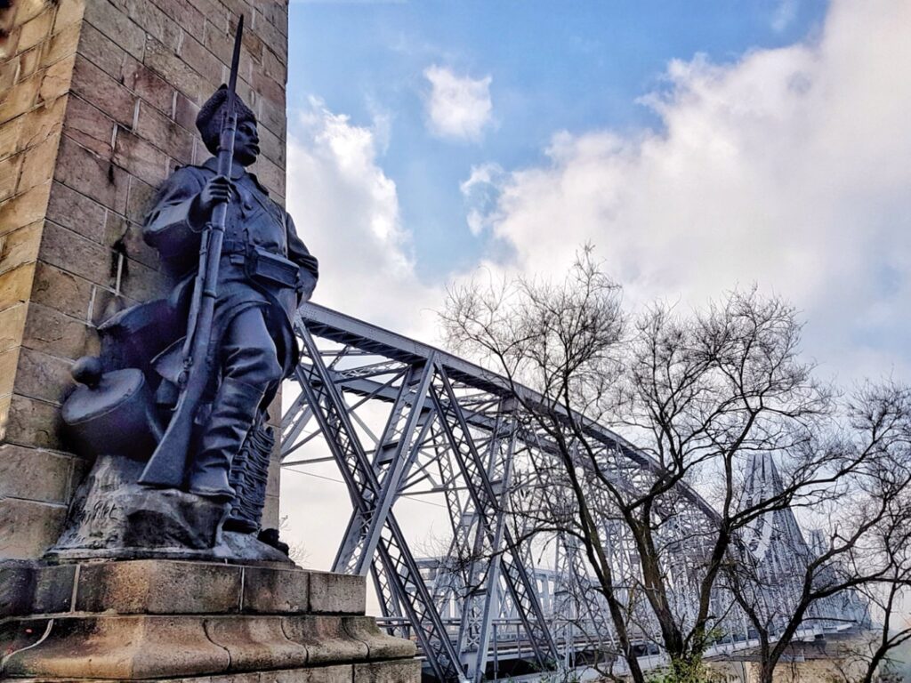 La capătul podului dinspre Cernavodă, în memoria eroilor căzuți în Războiul de Independență, a fost ridicat un impresionant monument din bronz, reprezentând doi dorobanți. Dorobanții și stemele au fost realizate de sculptorul francez Léon Pilet (1836-1916), o parte din contravaloarea lor fiind suportată de ambasada franceză de la București, ca un dar în cinstea regelui Carol I. Pilet a realizat mai întâi cinci modele diferite în miniatură, iar regele însuși a ales modelul care a fost realizat pentru pod. Statuile au fost turnate în trei bucăți la Lyon și mai apoi îmbinate la fața locului. Dorobanțul de pe partea nordică poartă semnătura autorului, alături de anul realizării (1895).