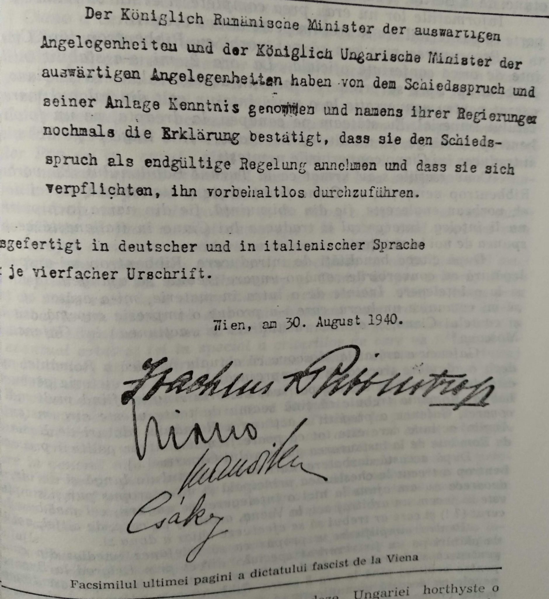 Pe 30 august 1940, la Palatul Belvedere din Viena, au fost semnate documentele „arbitrajului” germano-italian („Dictatul de la Viena”), prin care nordul Transilvaniei, începând de la Oradea, partea de sud-vest, şi Maramureş, partea de nord, înglobând Clujul şi judeţele de-a lungul versanţilor vestici ai Carpaţilor, până în apropiere de Braşov erau cedate Ungariei. Astfel, României i-au fost luaţi 43.492 km pătraţi din teritoriul naţional şi 2.667.000 de locuitori, din care 50,2% români, 37% unguri, 5,7% evrei şi 2,8% secui.