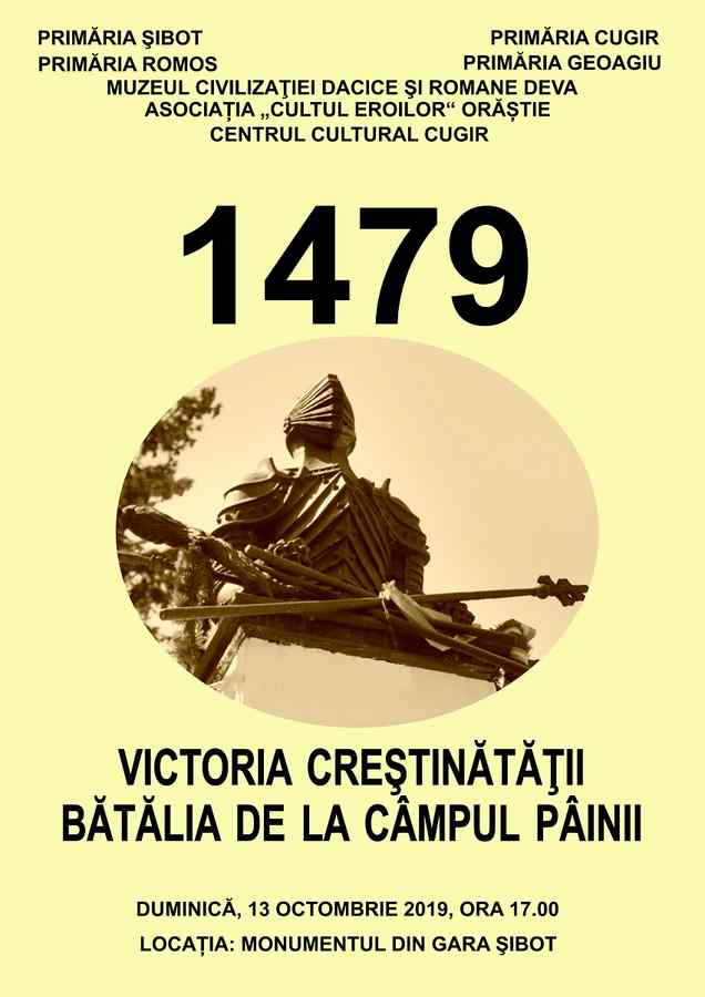 Mare eveniment mare la Monumentul din Gara Șibot. Manifestarea are loc duminică, 13 octombrie 2019, ora 17.00, la Monumentul din Gara Șibot și marchează aniversarea a 540 de ani de la «Bătălia de la Câmpul Pâinii». Evenimentul este sprijinit de primăriile din localitățile Cugir, Geoagiu, Romos, Șibot, împreună cu Muzeul Civilizației Dacice și Romane Deva, Asociația „Cultul Eroilor” Orăștie, Centrul Cultural Cugir. Comitetul de inițiativă este format din Dr. Mihai Căstăian și Centrul Cultural Cugir.