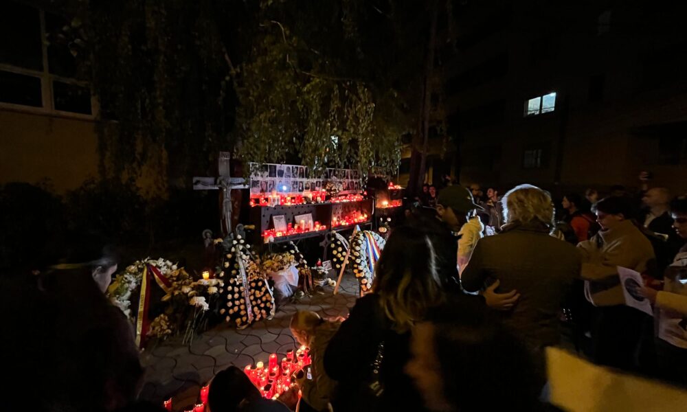 UPDATE: Oamenii au ajuns la monumentul victimelor incendiului din clubul Colectiv. Aceștia au adus flori, au aprins  lumânări și plâng privind la fotografiile oamenilor care au murit cu 10 ani în urmă.