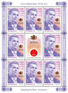 Începând de ieri, în magazinele Romfilatelia din Bucureşti, Bacău, Braşov, Cluj-Napoca, Iaşi, Timişoara, precum şi în magazinul online al companiei a fost introdusă în circulație emisiunea de mărci poștale Corul Madrigal, 55 de ani.