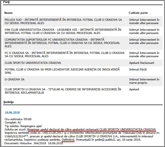 Iată ce au declarat într-un Comunicat şi reprezentanţii CS Universitatea: „Până în acest moment nu există nicio informare oficială vis-a-vis de procesul de la Timișoara, doar informațiile apărute în mass-media. Pentru o mai bună înțelegere a procesului de la Curtea de Apel Timișoara, facem următoarele precizări: Clubul Sportiv Univeristatea Craiova de drept public a sesizat instanța printr-o cerere să se pronunțe asupra existenței palmaresului în patrimoniul său. Instanța a respins această cerere fără a hotărâ dacă acesta îi aparține sau nu, așa cum Înalta Curte de Casație l-a folosit ca argument pentru a stabili că stema cu leul aparține Clubului Sportiv Universitatea Craiova. Pentru a exemplifica, este ca și cum o persoană, să spunem „Adrian Vasile” merge la instanță pentru a obține o hotărâre din care să reiasă că este acea persoană. Instanța îi va respinge cererea îndrumându-l către evidența populației, dar fără a se pronunța dacă este sau nu acea persoană. Ținem să precizăm că această hotărâre este cu recurs la Înalta Curte de Casație și Justiție unde va urma să fie dată decizia finală.