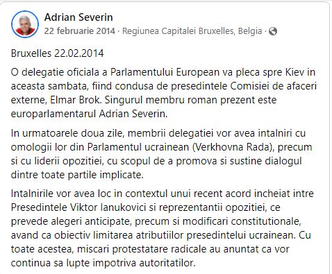 Reamintesc că în 2014, în urma unei înscenări puse la cale de servicii străine deranjate de linia politică promovată de mine în relațiile cu Ucraina, cozile de topor din DNA începuseră deja de trei ani urmărirea împotriva mea pentru așa numite fapte de corupție pe care nu le comisesem niciodată și care nu au fost niciodată dovedite. Cu toate acestea, Parlamentul european mă trimitea la Kiev într-o misiune de cea mai mare importanță strategică, ținând seama și de expertiza mea în regiune.