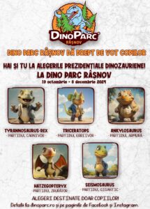 În acest final de an, Dino Parc Râșnov dă drept de vot copiilor și îi invită să voteze președintele dinozaurilor! Sâmbătă, 19 octombrie 2024, se dă startul campaniei electorale pentru Alegerile Prezidențiale Dinozauriene, organizatorii punând la dispoziția celor mici întregul arsenal al unui scrutin autentic: afișe și flayere electorale, cabine, urnă și ștampile de vot, dar și alte materiale informative. Toate acestea au menirea de a-i familiariza pe copii cu procesul electoral, cu importanța participării la vot, cu mecanismele unei campanii electorale, dar și cu terminologia specifică. Urna se va închide pe 8 decembrie 2024, la finalul programului cu publicul, când se va anunța și câștigătorul.