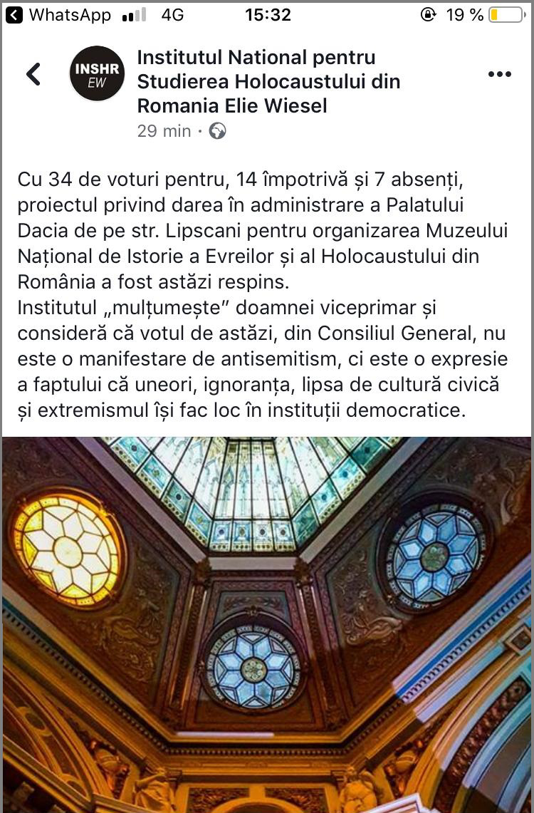 Pe WhatsApp, Institutul Naţional pentru Studierea Holocaustului din Romania „Elie Wiesel” a postat, la cîteva ore după decizia din CGMB, următorul mesaj: