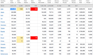 Numărul deceselor din cauza noului coronavirus a ajuns în SUA la 65.776, iar cel al îmbolnăvirilor se ridica la 1.131.452 sâmbătă dimineață, ora României, potrivit datelor actualizate continuu de worldometers.