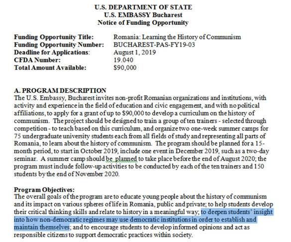 Ambasada a lansat și o a cincea competiție pentru ONG-urile românești, oferind un grant de până la 90.000 de dolari pentru dezvoltarea unei programe curiculare de predare a istoriei comunismului. „Proiectul trebuie conceput în vederea pregătirii unui grup de 10 traineri, selectați prin competiție, care să predea pe baza acestei programe curiculare și să organizeze două tabere de vară de câte o săptămână pentru 75 de studenți din orice domeniu și proveniți din toate regiunile României, la care aceștia să învețe despre istoria comunismului. Programul trebuie planificat pe o perioadă de 15 luni începând din octombrie 2019 și să includă un eveniment organizat în decembrie 2019 (posibil în timpul campaniei electorale pentru alegerile prezidențiale – n.r.), cum ar fi un seminar de două zile. O tabără de vară trebuie planificată să aibă loc înainte de august 2020; programul trebuie să includă activități de follow-up derulate de toți cei 10 traineri și de 150 de studenți la finalul lunii noiembrie 2020”, se menționează în anunțul Departamentului de Stat.