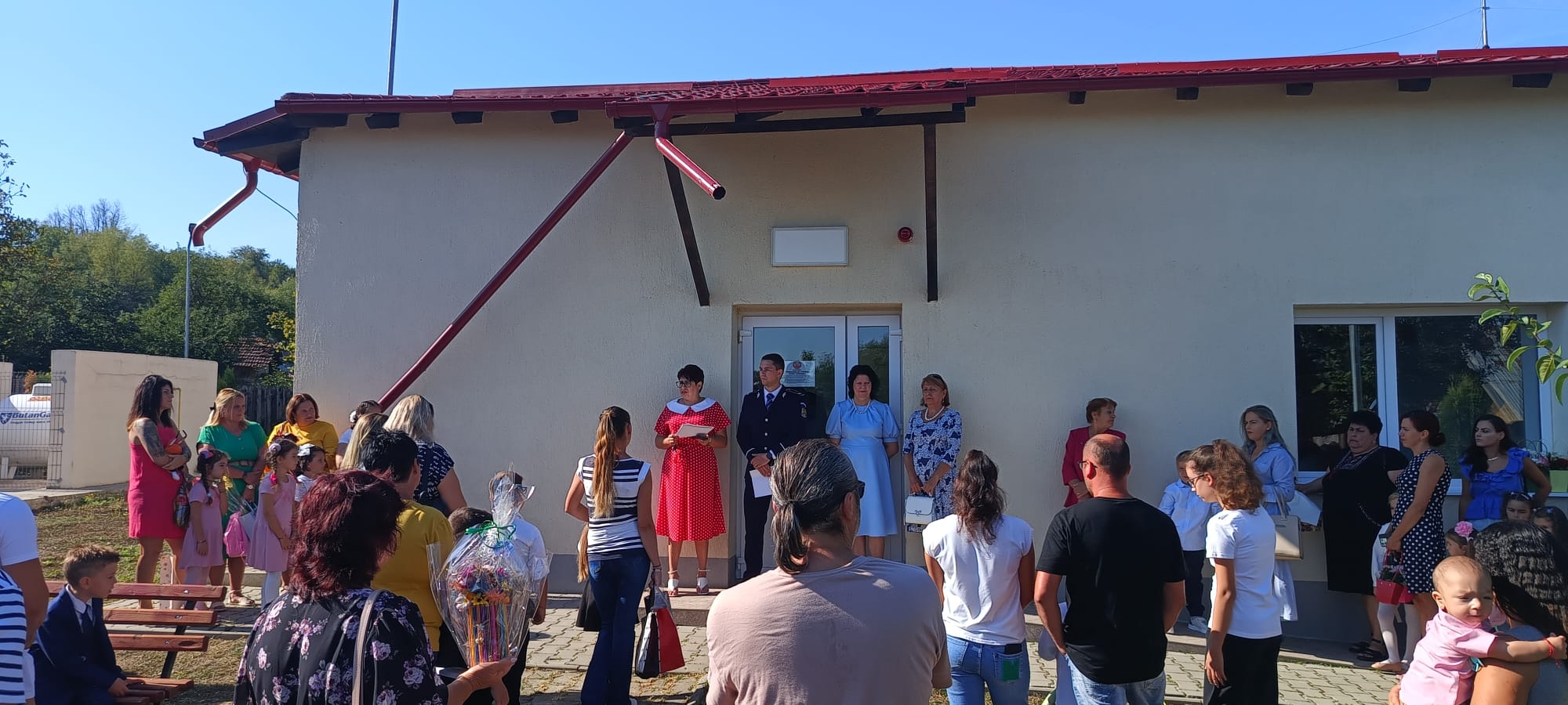 Parcă și aerul cald mirosea a emoții, gânduri, haine noi și creioane bine ascuțite. La grădinița și școala din sat, câteva zeci de elevi și copii de grădiniță au avut parte de festivitatea de deschidere a noului an școlar. Rândul de mașini parcate pe marginea străzii era cel mai mare semn că acolo se întâmplă ceva. Plus mașina de poliție care făcea ture în zonă.