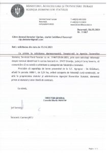În urma unei adrese la Agenția Domeniilor Statului, aceasta a răspuns că terenul are destinația curți-construcții și nu există nicio cerere de schimbare de destinație.