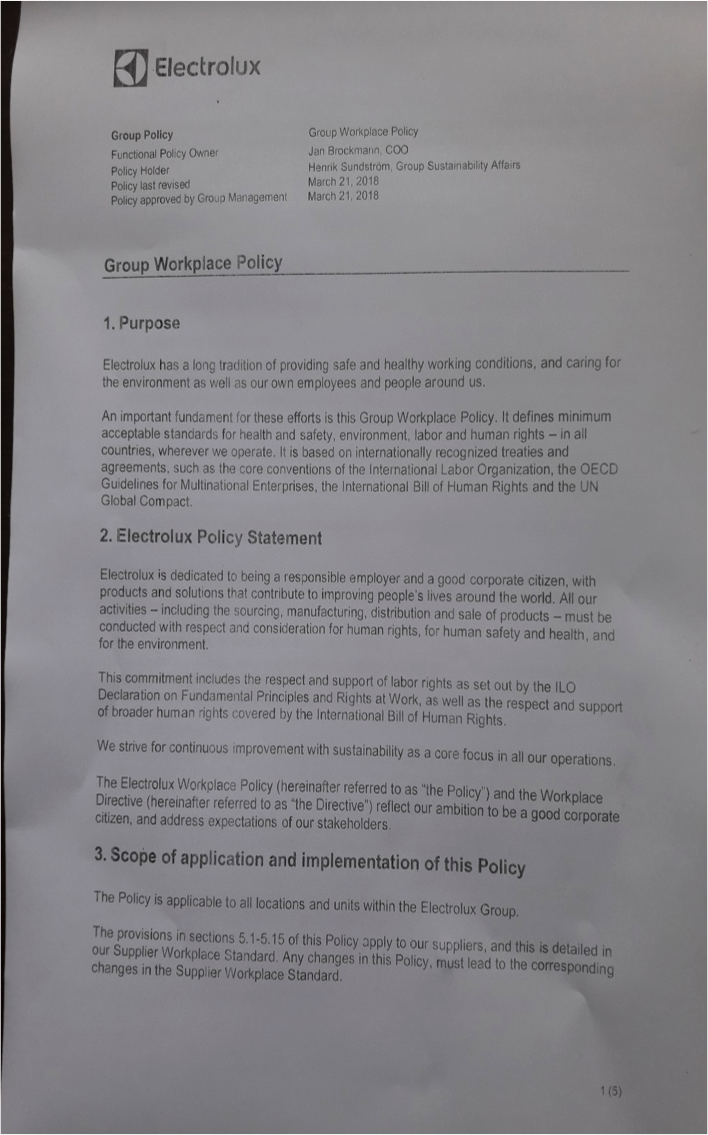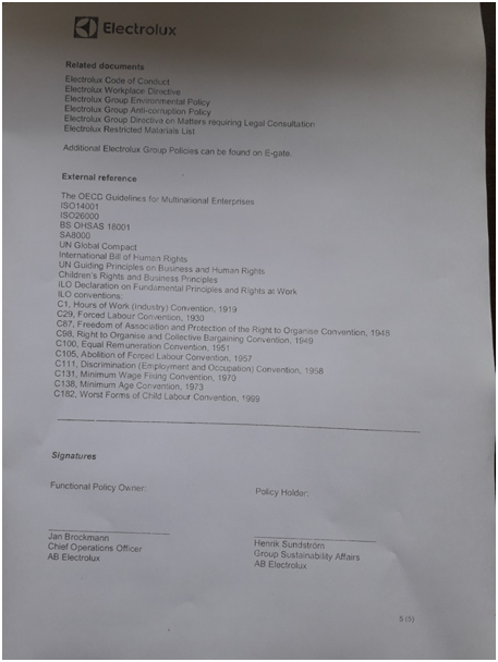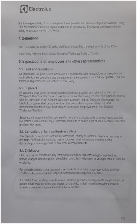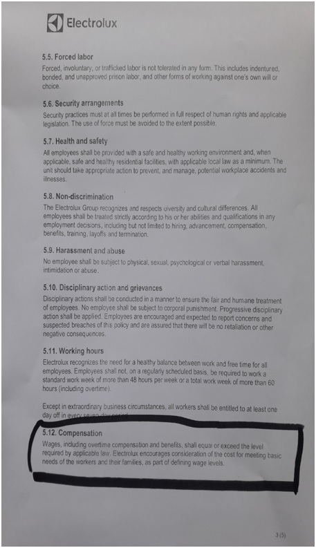 “Salariile, inclusiv compensațiile și beneficiile suplimentare, trebuie să fie egale sau mai mari decât nivelul cerute de legea aplicabilă. Electrolux încurajează luarea în considerare a costului pentru întâlnirea de bază nevoile muncitorilor și familiilor acestora, ca parte a definirii nivelului salariilor”.