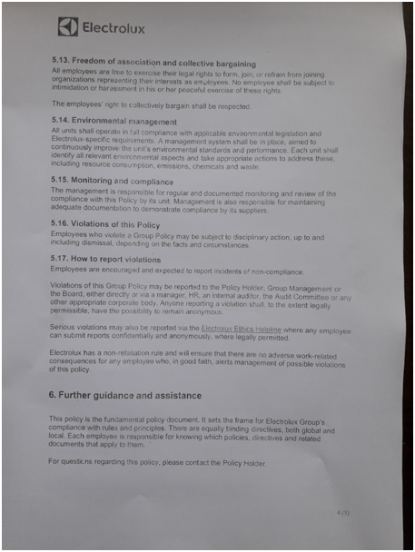 Compania Electrolux trebuie să se asigure că bunele intenții, declarate prin acest cod de conduită, au acoperire în fapte. În Romania, după cum s-a văzut, nu se întâmplă acest lucru, iar muncitorii care-i ajuta să producă echipamente electrocasnice, ce fac cinste oricărei industrii din această lume, sunt ținuți, în mod voit, la limita excluziunii sociale.