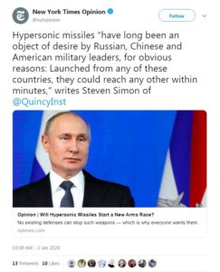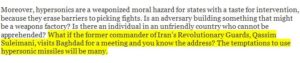Pe 2 ianuarie la ora 10.38 dimineața, ora Coastei de Est a SUA, contul Twitter al NY Times trimitea către un articol despre rachetele hipersonice și cursa înarmării dintre SUA, Rusia și China. La acel moment, în Irak era ora 18.38. Generalul Soleimani a fost ucis în urma unui atac american cu o dronă, pe aeroportul din Bagdad, pe 3 ianuarie, la ora 1.00, ora Irakului. În articolul publicat de NY Times scrie: ”Ce ar fi dacă fostul comandant al Gărzilor Revoluționare Iraniene, Qassim Suleimani, ar fi în vizită la Bagdad pentru o întâlnire și s-ar ști locația? Ar fi multe tentații de a folosi rachetele hipersonice”. Articolul este semnat de Steven Simon, ”analist la Institutul Quincy, profesor de practici în relațiile internaționale la Colby College (…) A fost director pentru Orientul Mijlociu și Africa de Nord în cadrul Consiliului Național de Securitate din 2011 până în 2012 și director pentru contraterorism din 1995 până în 1999”, după cum scrie The New York Times.