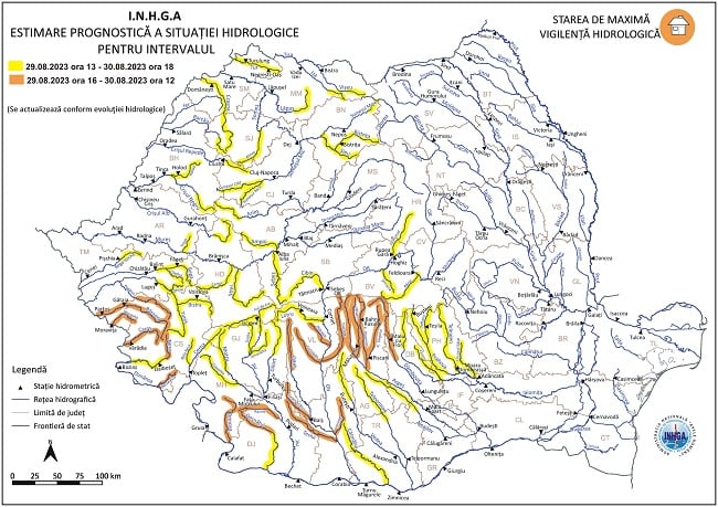 Specialiștii I.N.H.G.A. au actualizat Atenționarea Hidrologică emisă în cursul zilei de luni, instituind Codul portocaliu începând de astăzi, 29 august, ora 16:00, până mâine, la prânz.