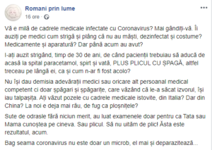 „Vă e milă de cadrele medicale infectate cu Coronavirus? Mai gândiți-vă. Îi auziți pe medici cum strigă și plâng că nu au măști, dezinfectat și costume? Medicamente și aparatură? Dar până acum au avut?