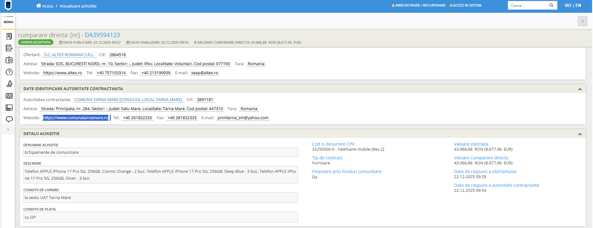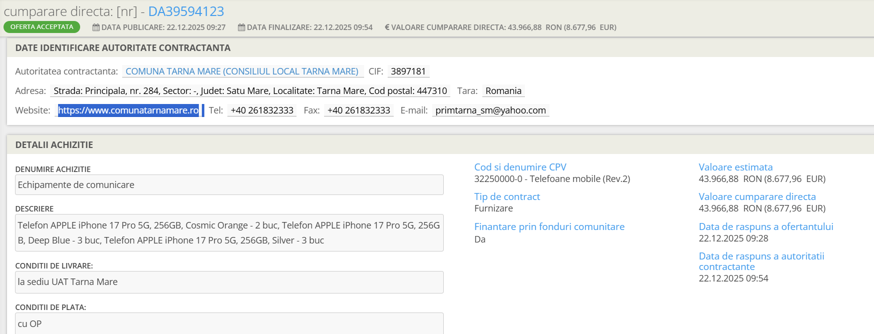Ulterior, primărița din Tarna Mare a trimis redacției Cotidianul mai multe capturi prin care cele 8 iPhone-uri 17 Pro au fost achiziționate prin programul „Accessible Health” (ROUA00287). Din documentul de pe platforma europeană de achiziții rezultă că prețul pentru un telefon a fost de 1.330 de euro cu TVA, iar valoarea totală pentru cele 8 smartphone-uri a fost de 10.640 de euro.
