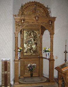 Pe tronul din Sfântul Altar se află una dintre cele mai renumite icoane din Sfântul Munte, Maica Domnului „Karyotissa”, cunoscută mai ales sub numele de „Axion Estin” (în greacă înseamnă Cuvine-se cu adevărat...).