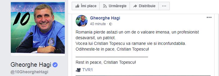 Și Gheorghe Hagi a ținut să scrie un mesaj de condoleanțe, pe pagina sa de socializare. Fostul fotbalist scrie că „România pierde astăzi un om de o valoare imensă, un profesionist desăvârșit, un patriot.Vocea lui Cristian Topescu va ramane vie si inconfundabila.