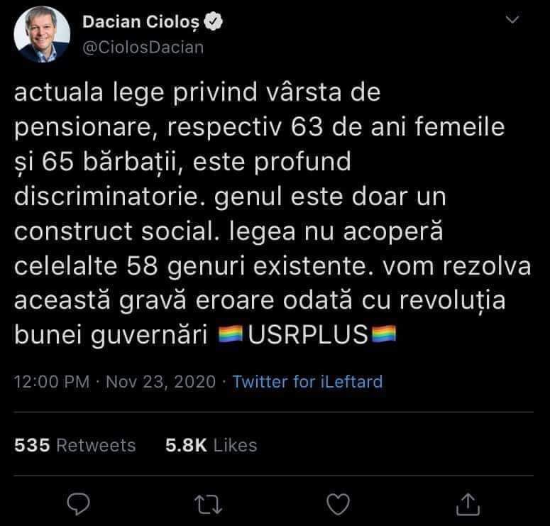 1. Mi se pare că pe Dacian Cioloș îl cam gîdilă la creier. De cînd s-a văzut mare la Bruxelles, pe bază de „unchiu”, i-a venit poftă și de gîndire înțeleaptă și reformatoare. Și tot ce i se șoptește la ureche este tradus de scăfîrlia puiului de milițian din Sălaj în ideologie europeană și atlantică. Nu este vorba de strategie NATO sau de ceva economie, ci de introducerea în drepturi a homosexualilor, lesbienelor și travestiților. Gîndirea sexo-politică a lui Dacian Cioloș ne trimite cu gndul la episodul MISA!