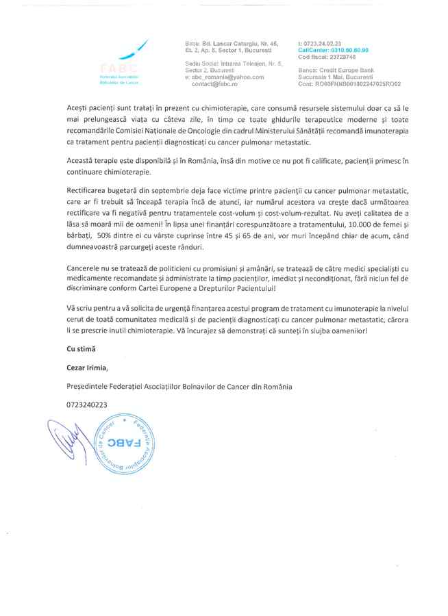 Federația Asociațiilor Bolnavilor de Cancer din România a transmis astăzi o scrisoare deschisă către prim-ministrul României Mihai Tudose și Ionuț Mișa – ministrul de Finanțe, prin care solicită de urgență finanțarea programului de tratament cu imunoterapie. Aceasta este singura șansă la viață pentru pacienții diagnosticați cu cancer pulmonar metastatic, singura șansă de supraviețuire pentru acești pacienți.