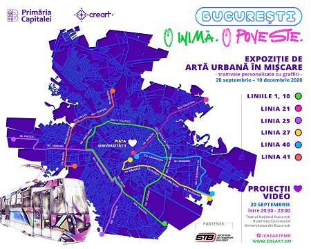 Duminică, 20 septembrie 2020, începând cu ora 9:00, 7 garnituri de tramvaie personalizate cu graffiti, purtând amprenta unora dintre cei mai buni artiști de street art din București, vor porni într-o expoziție de artă urbană în mișcare, către mai multe zone ale Capitalei.
