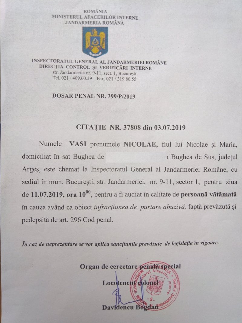 Pe parcursul anchetei, în mod curios, victima călcată la propriu de jandarmi este chemată tocmai în sediul central al Jandarmeriei de la București, adică este audiată chiar de cei care l-au abuzat. Cum de a delegat Parchetul Militar un jandarm drept organ de cercetare specială, rămâne un mister. Cu citația în mână, Vasi Nicolae trăia o dilemă: dacă îl cheamă Jandarmeria să-l mai bată încă o dată ?