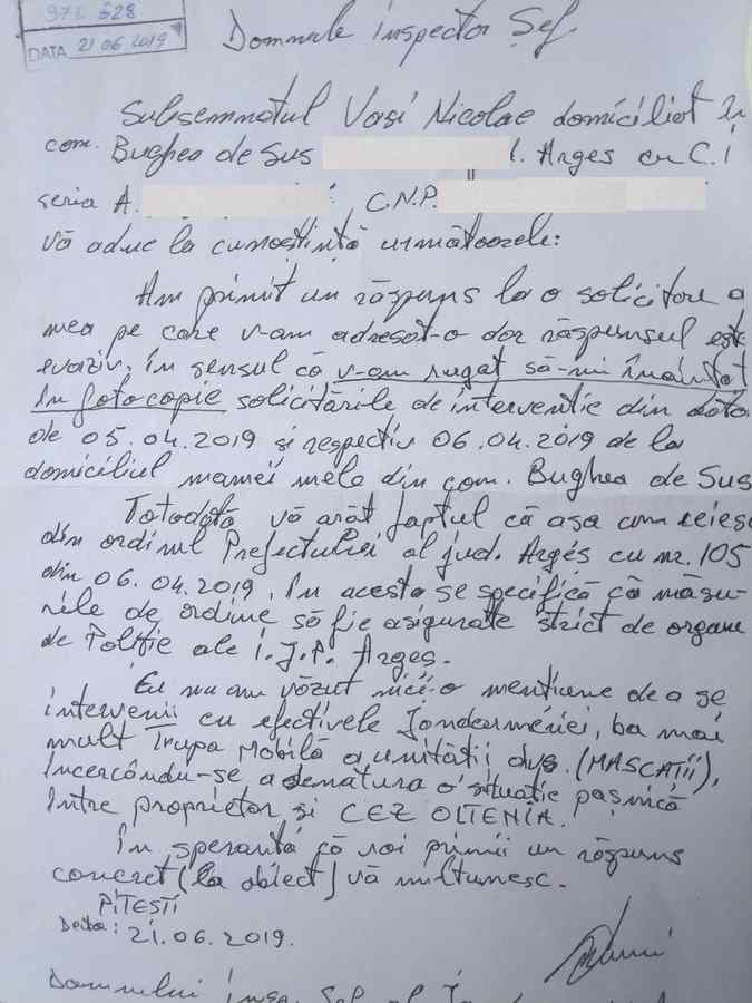 Cert este că cetățeanul Vasi a fost călcat în picioare în conformitate cu protocolul dintre Jandarmeria Română și societatea Distribuție Energie Oltenia S.A., după cum aflăm din răspunsul primit de victimă de la Inspectoratul de Jandarmi Județean Argeș cu numărul 995.926/ 06.06.2019:” Cadrele militare din cadrul Inspectoratului de Jandarmi Județean Argeș au acționat în zilele de 05 și 06 aprilie 2019 pe raza comunei Bughea de Sus, strada Măgurii în conformitate cu cadrul legal în vigoare, respectiv Legea 550/2004 privind organizarea și funcționarea Jandarmeriei Române și Protocolul de colaborare dintre Jandarmeria Română și Distribuție Energie Oltenia S.A. cu nr. 74.607/23.08.2017.”