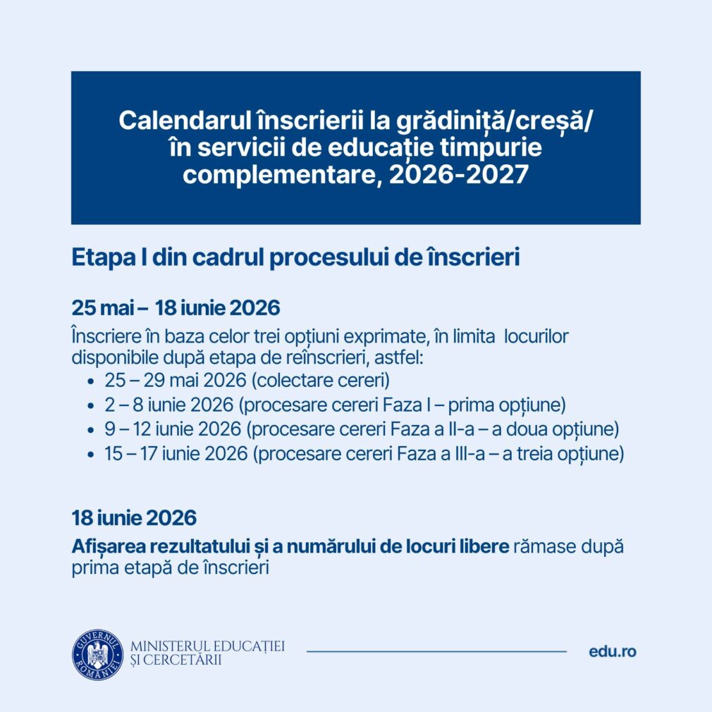 Ministerul Educației a stabilit forma finală a calendarului pentru înscrierea copiilor la creșă, grădiniță și în serviciile de educație timpurie complementare pentru anul școlar 2026–2027. Documentul prevede organizarea înscrierilor în etape, după finalizarea perioadei de reînscriere a copiilor deja înscriși în sistem.