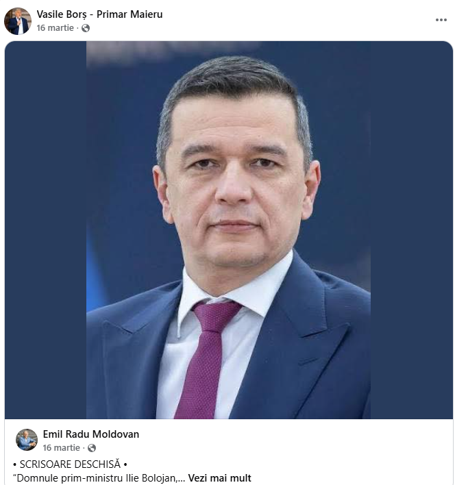 Comuna Maieru din județul Bistrița-Năsăud, condusă de Vasile Borș (PSD) din 2oo4, cu o pauză de un mandat între 2012-2016, a încheiat nu mai mult, nici mai puțin de 8 contracte cu firma lui Larionesi din 2018 până în 2025. Borș, de altfel, îi distribuie postările lui Radu Moldovan pe pagina sa de Facebook. Ultima este din 18 martie.