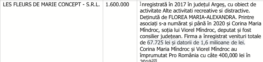 Expert Forum arată că Maria Corina Mîndroc și soțul ei, Cătălin Viorel Mîndroc, au împrumutat Pro România, partidul fondat de Victor Ponta, cu câte 400.000 lei în anul 2019.