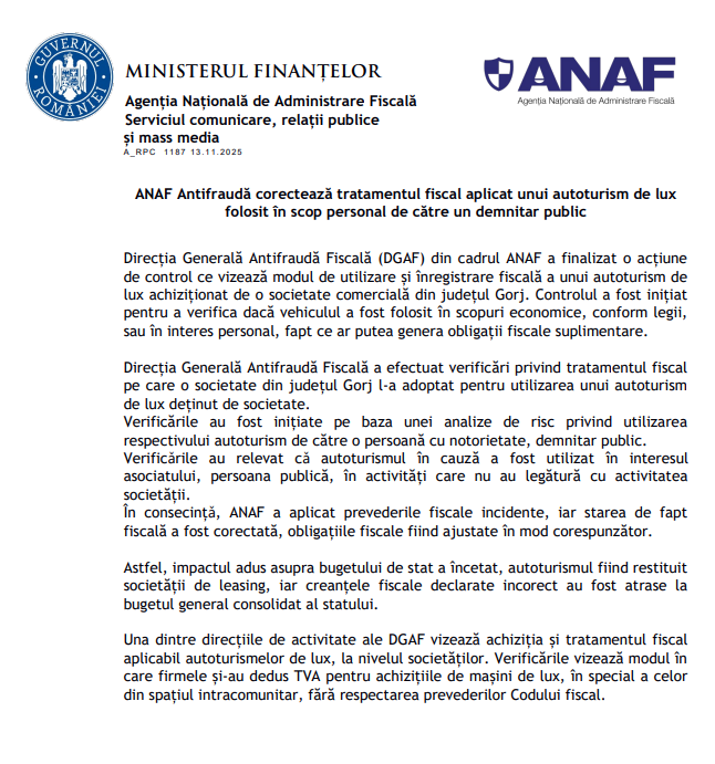 „Verificările au relevat că autoturismul în cauză a fost utilizat în interesul asociatului, persoana publică, în activități care nu au legătură cu activitatea societății”, se mai arată în comunicatul ANAF din 13 noiembrie 2025.