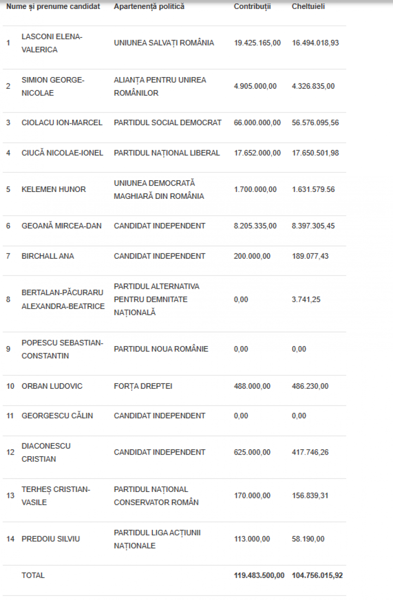 Candidații din primul tur al alegerilor prezidențiale au cheltuit peste 100 de milioane de lei pentru campania electorală.