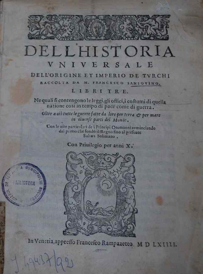 Graţie legăturilor diplomatice speciale pe care Republica veneţiană le-a avut de timpuriu cu Imperiul Otoman, scriitorii veneţieni (de diferite formaţii şi apartenenţă: negustori, dipolomaţi, călători, moralişti, istorici) au fost printre primii europeni care au avut acces direct la informaţii despre curtea şi personalităţile lumii otomane. Asimilând şi difuzând date despre civilizaţia otomană, veneţienii au fost la rândul lor influenţaţi de ea. Astfel s-a născut un curent literar care se manifestă la Veneţia în secolele XV-XVI, definit de specialişti drept „turcesc”. Unul dintre exponenţii acestui curent a fost Francesco Sansovino (Francesco Tatti da Sansovino), istoric, literat editor şi proprietar de tipografie – care avea ca marcă distinctivă o semilună. El se numără totodată printre cei mai cunoscuţi autori de popularizare a istoriei Italiei din această epocă. Din vasta sa operă deţinem și ediția adăugită a lucrării Del l’Historia universale del l’ origine et imperio de Turchi tipărită în 1564 (fig. 2), în care s-au inclus două texte ale altor scriitori din curentul turcesc: Antonio Menavino (despre viaţa şi legile turcilor) şi Andrea Cambini (Libro della origine de Turchi et imperio delli Ottomani, care este izvor narativ pentru domnia lui Ştefan cel Mare ).