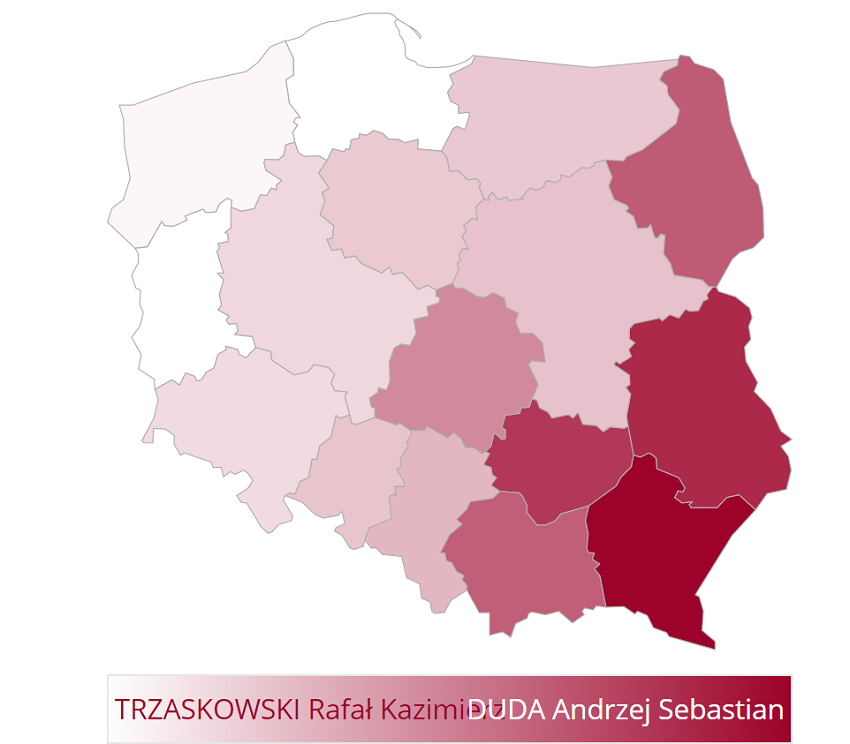 In diaspora, Trzaskowski a câştigat în 78 de ţări, cele 7 în care preşedintele Duda s-a impus fiind SUA, Canada, Rep.Belarus, Ucraina şi Kazahstan, alături de Nigeria şi Etiopia. Scorul său a fost 25,88% (107.647 de voturi), faţă de zdrobitorul 74,12% (308.304 voturi) al lui Trzaskowski. In schimb, în ţară, opoziţia nu s-a impus decât în 624 de comune, în timp ce preşedintele Duda a obţinut majoritatea în 1872 de comune. La nivelul oraşelor, Trzaskowski a căştigat în 176 dintre acestea, faţă de numai 122 care au votat în favoarea lui Duda. Dintre cele 16 voievodate ale Poloniei, 10 au fost adjudecate de opoziţie şi numai 6 de candidatul susţinut de guvern. O observaţie se impune: voievodatul Mazovia, ce include Varşovia, a avut o majoritate pro-Trzaskowski numai pe baza voturilor precumpănitoare din capitală şi din suburbiile acesteia. La 50 de kilometri distanţă, în comuna Parysów, de exemplu, 86% dintre voturi au fost în favoarea lui Duda, iar la Rusinów, la o depărtare de 100 km de centrul politic al ţării, 88% au fost pro-Duda.