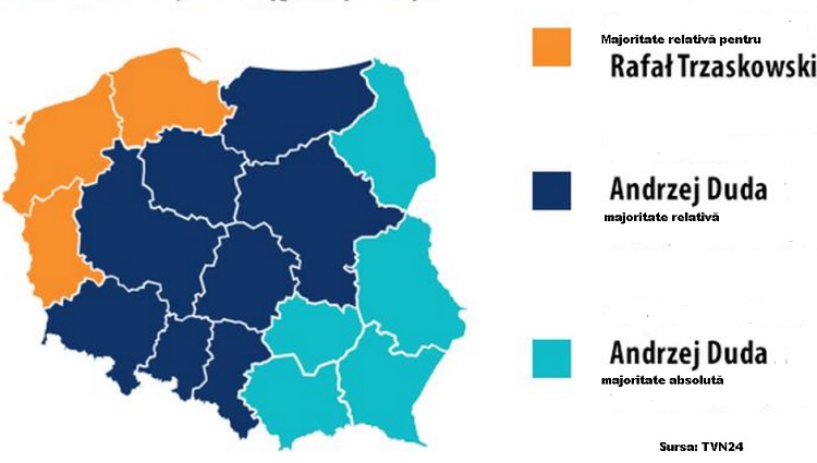 Conform acelui sondaj, candidatul spre care se vor îndrepta, în turul II, mai toate speranţele polonezilor ce doresc o schimbare faţă de configuraţia politică actuală, dominată partidul PiS [Lege şi Justiţie], principala formaţiune a coaliţiei Dreapta Unită, reuşise să-l devanseze pe Andrzej Duda doar în patru din cele 16 voievodate ale ţării şi în marile oraşe. Acest fapt a fost infirmat de rezultatele parţiale de după numărarea a 99,78% din voturi: raportul real devenind de 3 / 13; voievodatul Opole din colţul de sud-vest al ţării, atribuit iniţial lui Trzaskowski, are, în cele din urmă, o majoritate relativă de voturi pentru Duda. Acesta nu a reuşit să câştige în cele trei voievodate din nord-vestul ţării.