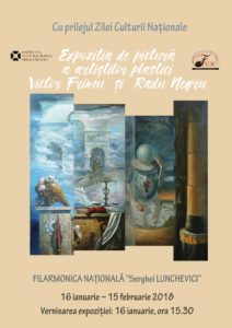 În 16 ianuarie, la ora 15.30, la Galeria Filarmonicii Naţionale „Serghei Lunchievici”, Institutul Cultural Român „Mihai Eminescu” de la Chișinău în colaborare cu Filarmonica Națională „Serghei Lunchievici” organizează o expoziție specială de pictură, a tinerilor artişti plastici Victor Frimu şi Radu Negru.