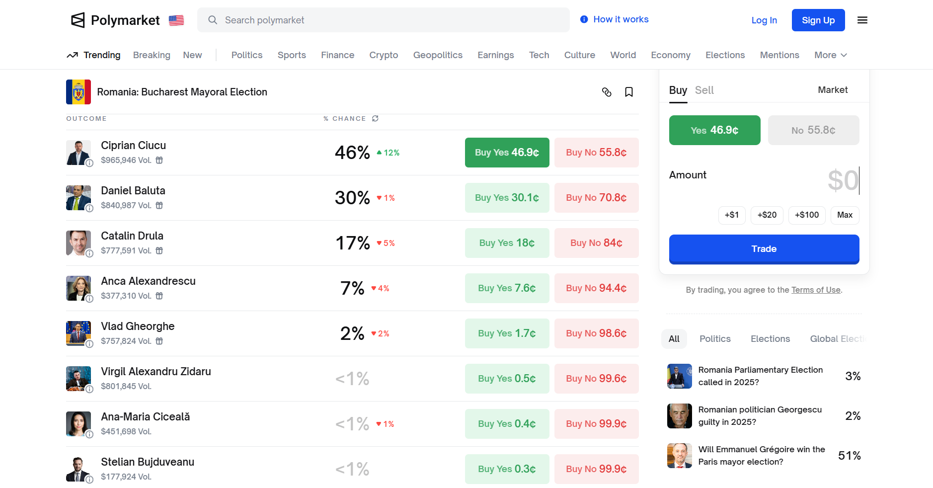 Disponibilă încă în România, platforma îl plasează pe Ciprian Ciucu în poziția de principal favorit la alegerile pentru Primăria București. Acesta este cotat cu 45% de câștig, după ce s-au pariat peste 960.000 de dolari pe victoria sa.