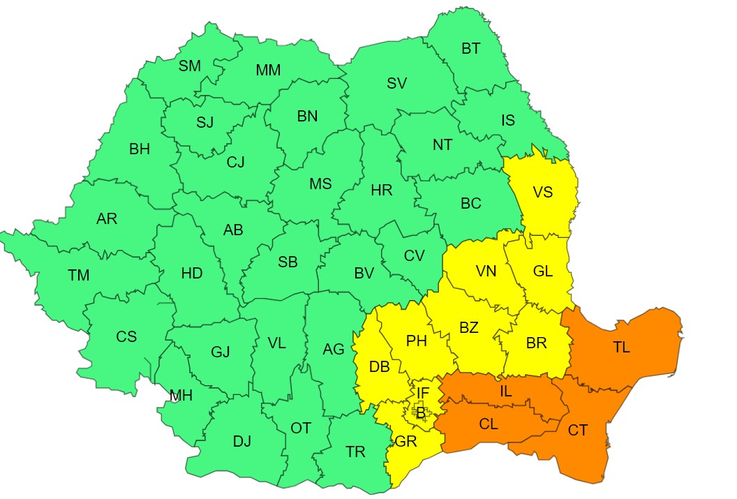 De asemenea, Administraţia Naţională de Meteorologie (ANM) a emis o avertizare Cod galben de instabilitate atmosferică valabilă marţi, între orele 10.00 şi 20.00.