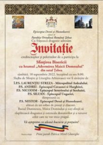 – Sâmbătă, Mitropolitul Ardealului, Laurențiu Streza, împreună cu Episcopul Devei și Hunedoarei, Preasfințitul Nestor și un sobor de Arhierei și preoți, vor oficia slujba de sfințire a noii picturi a Bisericii Ortodoxe „Adormirea Maicii Domnului” de la Țebea, comuna Baia de Criș.