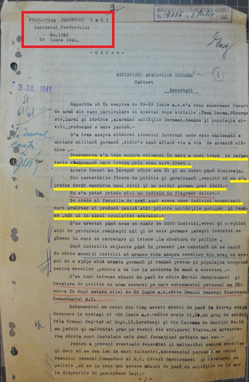 „Nu s-a putut prinde nici un individ în flagrant delict. Se crede că focurile de armă sunt opera unor indivizi organizați care urmăresc să producă panică atât printre unitățile germane și române, cât și în sânul populației orașului […] După indiciile obținute până în prezent, se constată că se caută de către anumiți indivizi să arunce vina asupra evreilor din oraș cu scopul de a ațâța atât armata germană și română precum și populația creștină contra evreilor, pentru a da loc la uciderea în masă a acestora.”, arată prefectul.