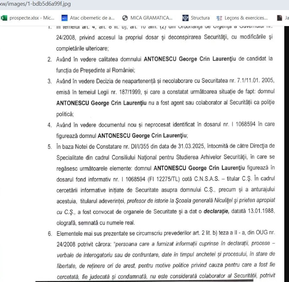 ”Având în vedere faptul ca nota de constatare nr. DI/I/355 din data de 31.03.2025 nu consemnează existenţa altor documente sau informaţii privind relaţia cu organele de Securitate, în cazul domnului ANTONESCU George Crin Laurenţiu nu se poate reţine calitatea de colaborator al Securităţii, în sensul legii. Totodată, potrivit notei de constatare nr, DI/I/355 din data de 31.03.2025, în urma verificărilor întreprinse până la data de 31.03.2025 nu au rezultat documente sau informaţii privind apartenenţa la structurile fostului Minister de Interne, în calitate de ofiţer sau subofiţer de Securitate sau Miliţie, astfel încât în cazul domnului ANTONESCU George Crin Laurenţiu nu se poate reţine calitatea de lucrător al Securităţii, în sensul legii”, se mai arată în adeverinţă.
