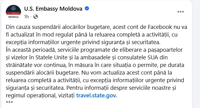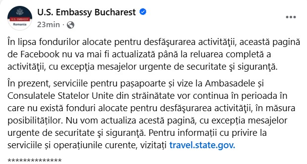 Criza din SUA are efecte rapide. La doar câteva ore de la anunțul care cutremură lumea, Ambasadele americane din România și Moldova anunță deja că vor avea activitatea redusă.