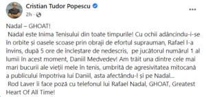 Am trăit una dintre cele mai mari bucurii ale vieții mele în tenis, umbrită de agresivitatea mitocană a publicului împotriva lui Daniil, asta afectându-l și pe Nadal…”, a scris Cristian Tudor Popescu, pe Facebook.