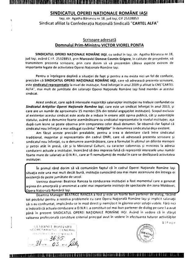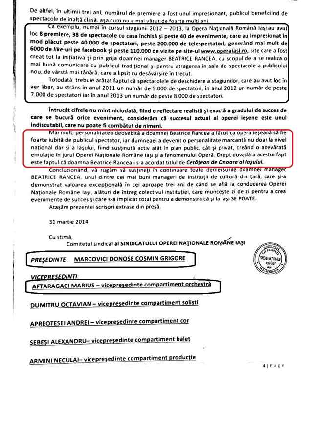 În urmă cu câțiva ani în urma, acelaşi Marcovici avea calitatea de președinte al sindicatului ARTIS Moldova, reprezentativ la nivelul Operei şi trimitea a trimis o scrisoare elogioasă către prim-ministrul Victor Viorel Ponta, în care vorbea despre ”venirea doamnei Beatrice Rancea la conducerea instituției” ca fiind „momentul care a generat ieșirea din amorțeală și anonimat”.