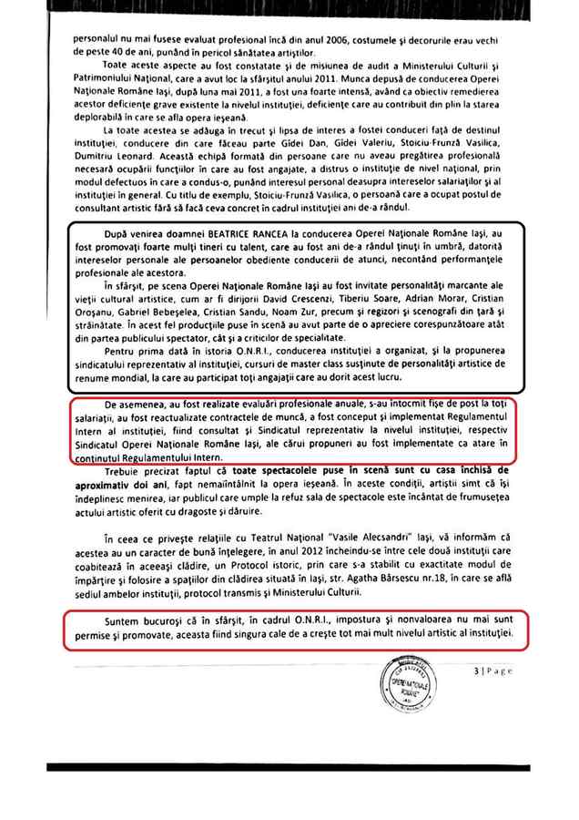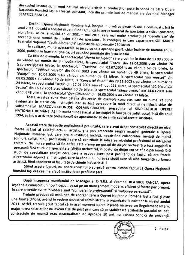 Tot Marcovici spunea că “în cadrul Operei Naţionale Române Iaşi situaţia este una mai mult decât bună”, iar în ceea ce o priveşte pe Beatrice Rancea aceasta este numită “unul dintre cei mai buni manageri de instituţii de cultură din ţară, care şi-a demonstrat valoarea excepţională în cei doi ani de când se află la conducerea Operei Naţionale Române Iaşi.”