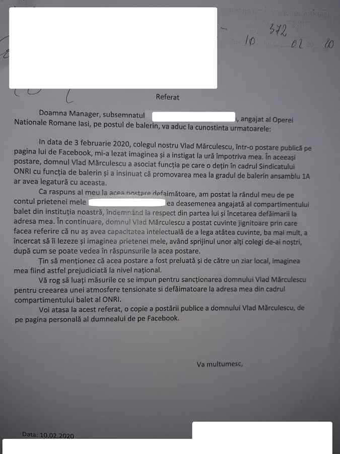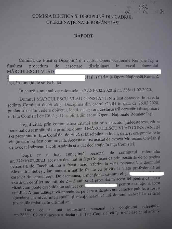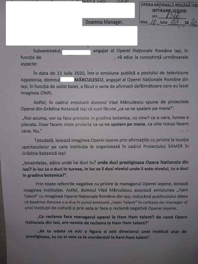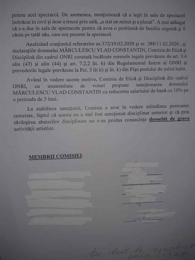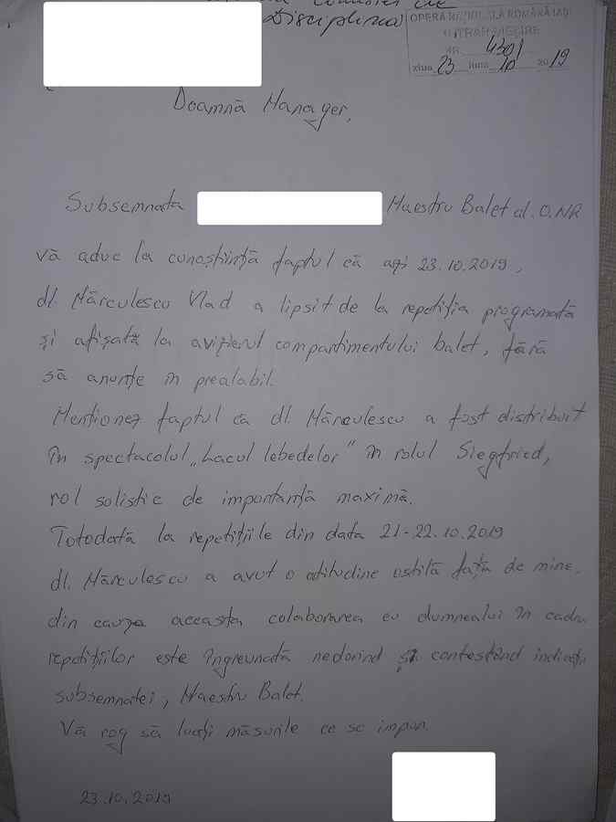 Dar ca să înțelegem cazul trebuie să ne întoarcem în anul 2019 când maestrul de balet înaintează o adresă managerului în care îi aduce la cunoștința că Mărculescu Vlad a lipsit de la repetiția generală programată și afișată la avizierul compartimentului balet, fără să anunțe în prealabil, iar din data de 21-22.10.2019 a avut o atitudine ostilă, contestând indicațiile maestrului de balet.