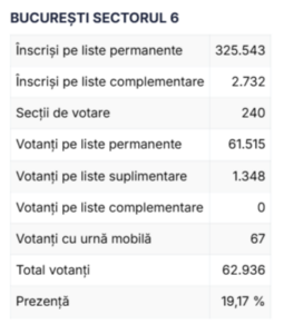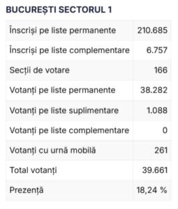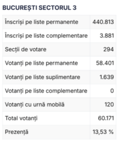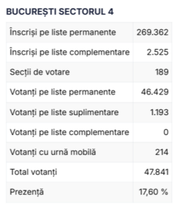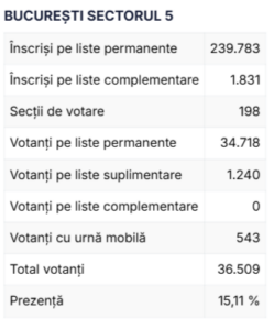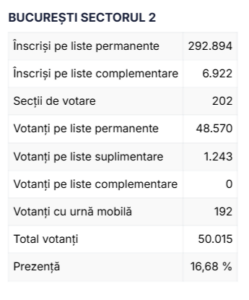 Sectorul 2 se menține constant pe poziția a patra, cu o prezență de 16,68% (peste 50.000 de alegători), în timp ce Sectorul 5 rămâne pe penultimul loc, cu 15,11% – puțin peste 36.000 de votanți.