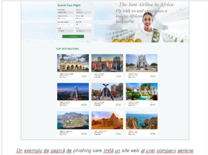 Cele mai multe călătorii încep cu rezervarea unui bilet de avion sau de tren, iar pasionații de călătorii sunt adesea interesați să pună mâna pe un chilipir. Experții Kaspersky au văzut numeroase site-uri false care pretind că oferă utilizatorilor șansa de a cumpăra bilete de avion la costuri mai reduse. Astfel de site-uri web sunt, de obicei, pagini de phishing bine realizate, care imită serviciile renumitor companii aeriene și agregatori de bilete de avion. Unele dintre aceste site-uri web chiar afișează detaliile zborurilor reale, phisheri cu experiență trimit solicitări de căutare către agregatorii de zboruri și afișează informațiile primite de la aceștia. Dar în loc să livreze biletele de avion promise, infractorii fură banii utilizatorilor și folosesc informațiile lor personale în scopuri rău intenționate (de exemplu, vânzarea pe dark web a detaliilor bancare și a informațiilor de identificare).