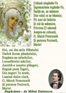 De ziua lui Mihai Eminescu, 15 ianuarie, ne îndreptăm gîndurile către, poate, cea mai frumoasă rugăciune scrisă către Maica Domnului. Eminescu era fascinat de tihna patriarhală din așezările călugărești.