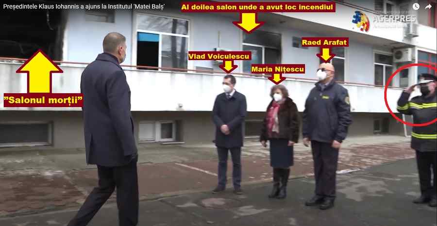 Îl vedeți? Chiar sub geamul „Salonului morții”, Klaus Iohannis avea chef de protocol cu „Onor” dat de șeful pompierilor, în prezența lui Vlad Voiculescu, Maria Nițescu, noul manager de la „Matei Balș” și, desigur, a lui Raed Arafat! Lîngă Iohannis vedeți pereții afumați de la cele două saloane incendiate.