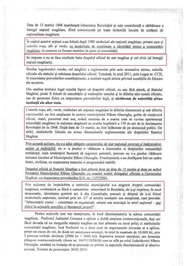 Ulterior, anul acesta, în urma unei sesizări la Consiliul Național pentru Combaterea Discriminării a Asociației Civice pentru Demnitate în Europa (ADEC), primarul UDMR din Sfântu Gheorghe, Antal Arpad, justifică gestul său prin faptul că în cauză nu este vorba despre drapelul Ungariei ci, atenție!, drapelul întregii națiuni maghiare. Simbolul roșu, alb și verde a fost arborat pe străzile din Sfântu Gheorghe „ca o modalitate de exprimare a identității etnice a comunității maghiare”.